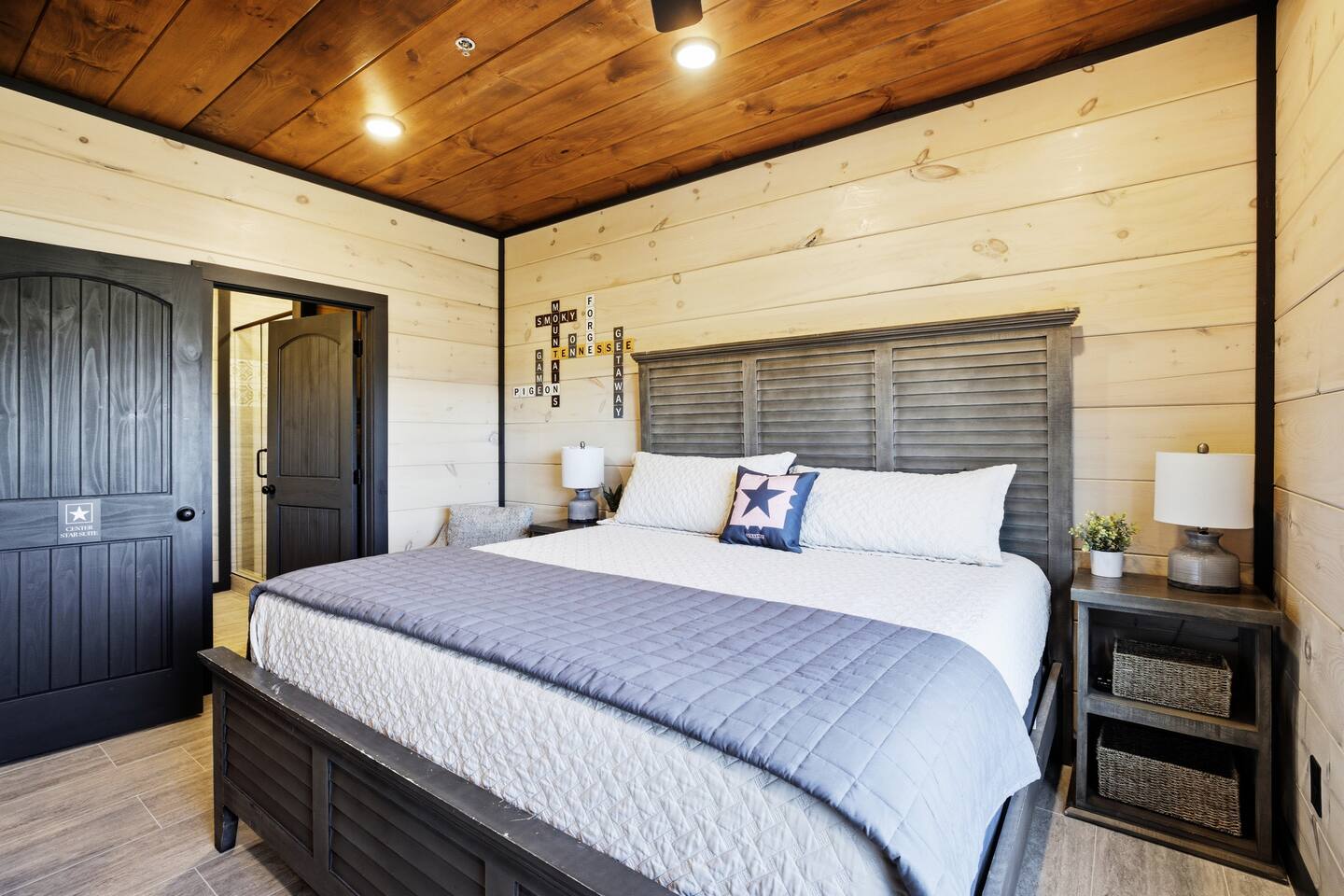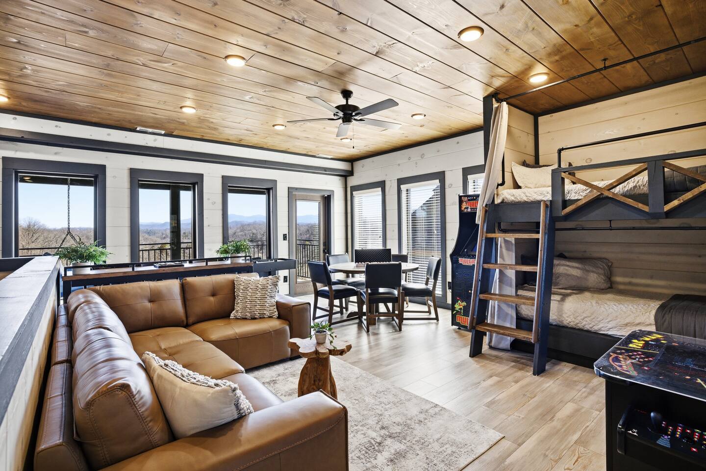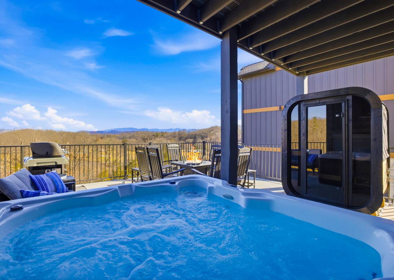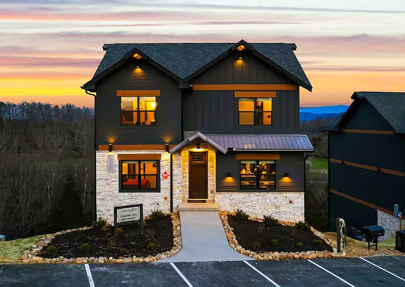 Game on Getaway — a new luxury cabin with stunning mountain views, high-end amenities, 5 bedrooms and 6 baths, comfortably accommodating up to 18 guests. This cabin includes access to a Water Park/Resort and is full of unique, private amenities - sauna, exercise bike, weights, hot tub, heated indoor pool, theater room, PS5, Nintendo Switch, arcades, and EV charger. Located just 5 minutes from the Smoky Mtn Pkwy, Game on Getaway offers the perfect blend of relaxation, play, and mountain memories.