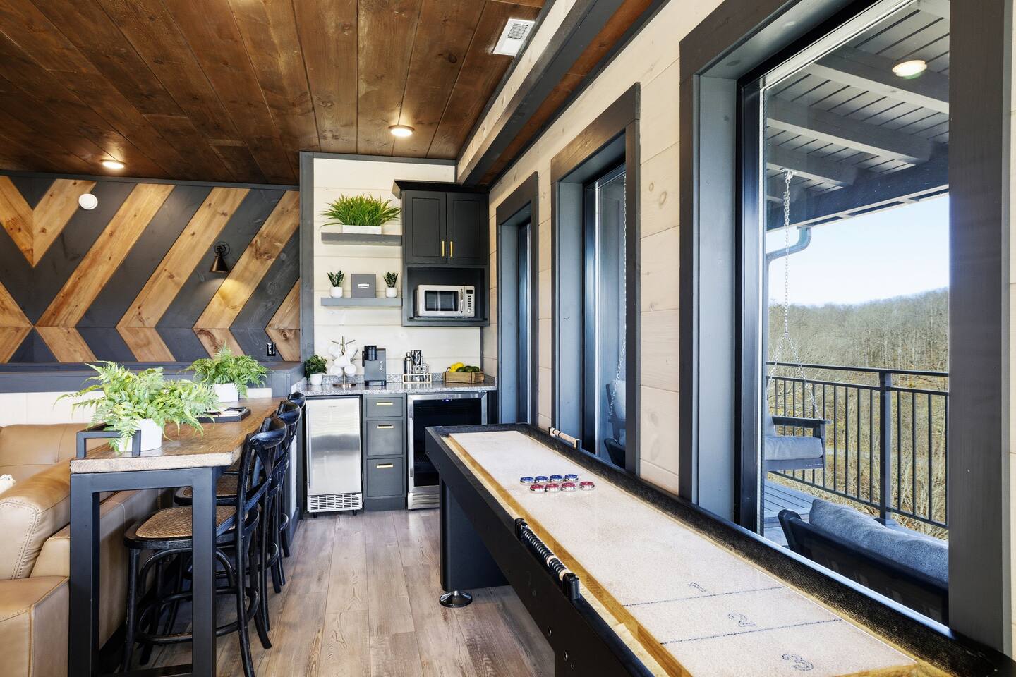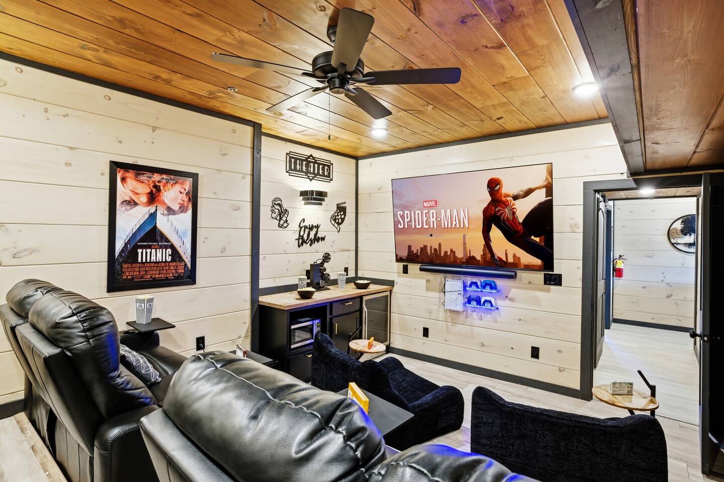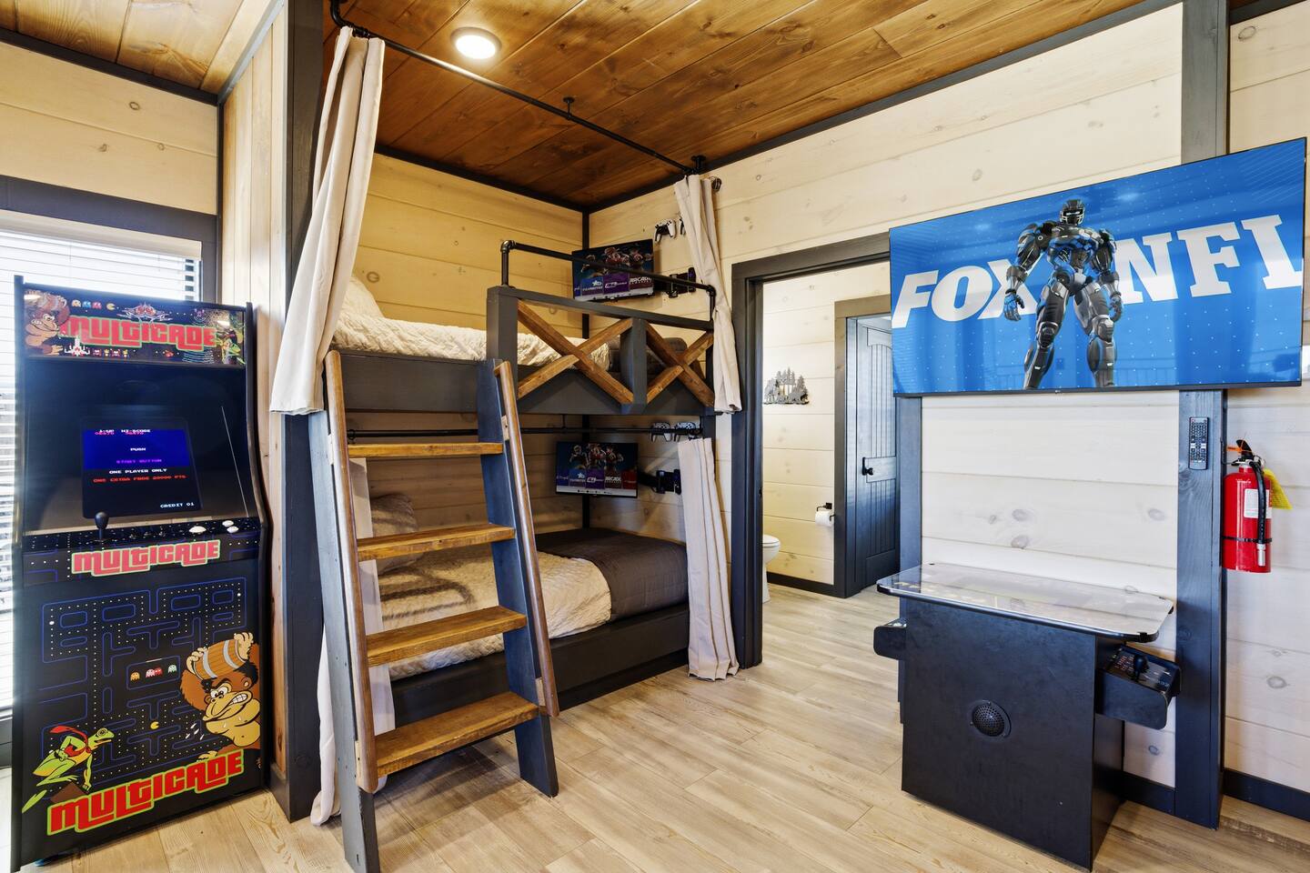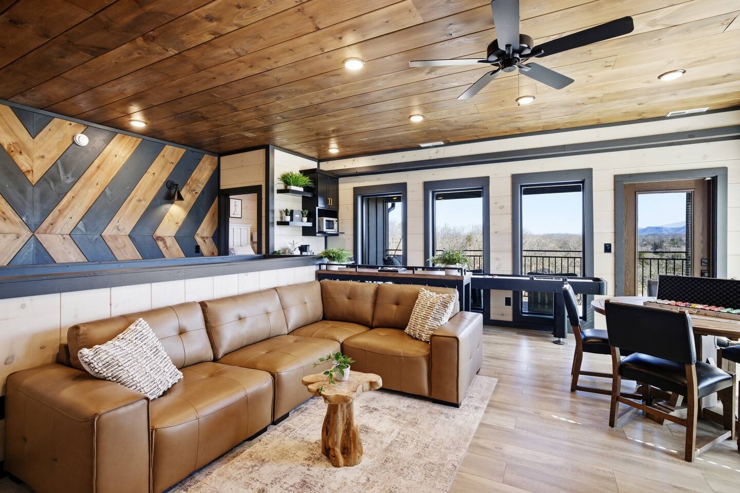 Game on Getaway — a new luxury cabin with stunning mountain views, high-end amenities, 5 bedrooms and 6 baths, comfortably accommodating up to 18 guests. This cabin includes access to a Water Park/Resort and is full of unique, private amenities - sauna, exercise bike, weights, hot tub, heated indoor pool, theater room, PS5, Nintendo Switch, arcades, and EV charger. Located just 5 minutes from the Smoky Mtn Pkwy, Game on Getaway offers the perfect blend of relaxation, play, and mountain memories.